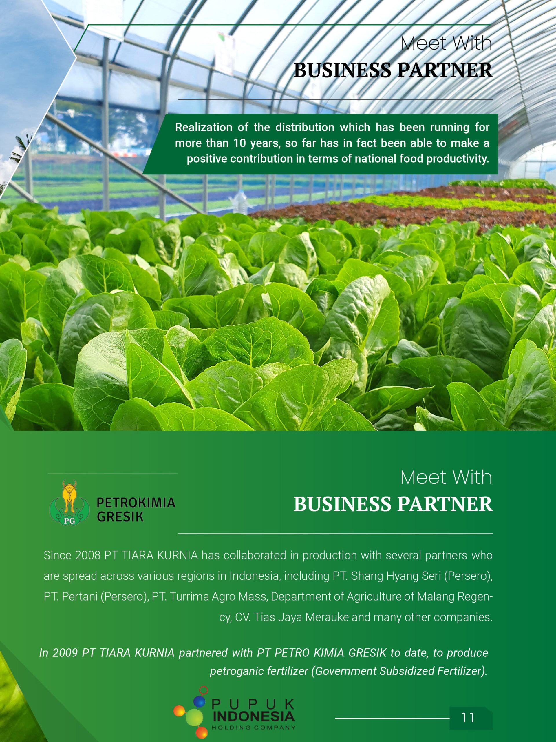 Realization of the distribution which has been running for more than 10 years, so far has in fact been able to make a positive contribution in terms of national food productivity. Since 2008 PT TIARA KURNIA has collaborated in production with several partners who are spread across various regions in Indonesia, including PT. Shang Hyang Seri (Persero), PT. Pertani (Persero), PT. Turrima Agro Mass, Department of Agriculture of Malang Regency, CV. Tias Jaya Merauke and many other companies. In 2009 PT TIARA KURNIA partnered with PT PETRO KIMIA GRESIK to date, to produce petroganic fertilizer (Government Subsidized Fertilizer).